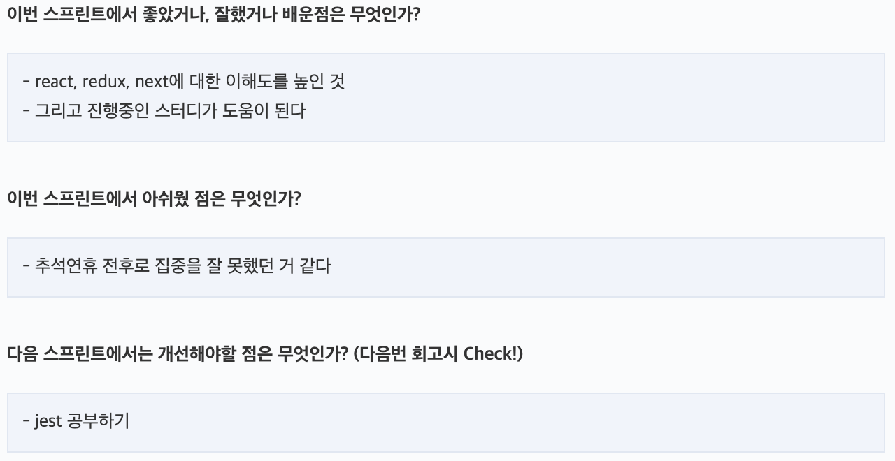 스프린트 회고 큰 프로젝트를 완성하기 위하여 스프린트 라는 단위가 3주씩 있다. 3주 스프린트마다 스프린트 계획을 세우고, 스프린트가 끝나면 어땠는 지에 대한 '회고 시간'이 있다. 그렇다고 딱딱한 분위기는 절대 아니었다 ! 🤭 스프린트 동안 좋았던 점, 아쉬웠던 점, 다음 스프린트에서 할 일 들을 한 사람당 3분 정도 말하면서 마무리하는 분위기였다. 최근 나의 스프린트 회고를 공개해본다 ㅎㅎ