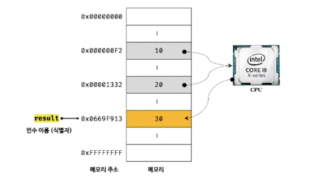 - 변수 선언이란, 메모리 공간을 확보하고 변수 이름과 확보된 메모리 공간의 주소를 연결하여 값을 저장할 수 있도록 준비하는 것이다.