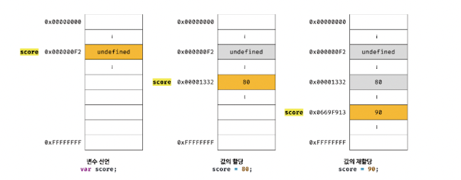 변수에 값을 80에서 90으로 재할당하면, 80이 저장되어 있던 메모리 공간은 지우고, 그 메모리 공간에 재할당 값 90을 저장하는 것이 아니라, 새로운 메모리 공간을 확보하고 그 메모리 공간에 숫자 값 90을 저장한다.