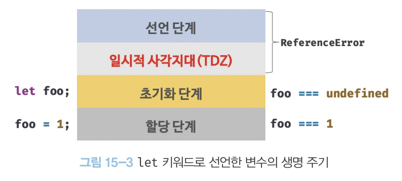let 키워드로 선언한 변수는 선언 단계와 초기화 단계가 분리되어 진행된다. 스코프의 시작 지점부터 초기화 시작 지점까지 변수를 참조할 수 없는 구간을 '일시적 사각 지대'(Temporal Dead Zone)라고 부른다. 이 구간에서는 변수를 참조할 수 없어, 마치 변수 호이스팅이 발생하지 않는 것처럼 보인다.