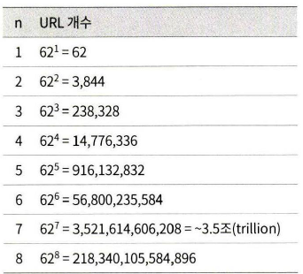 62 ^ 6 = 568억 이므로, 길이가 6일 때에는 568억, 길이가 7일 때에는 3조개의 url을 감당 가능하다.