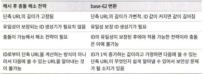충돌 발생 시에는, 문자열을 해시값에 덧붙이는 방식을 사용하면 충돌 해소가 가능하지만 url 생성 시에 한 번 이상 데이터베이스 질의를 해야하므로 오버헤드가 크다.